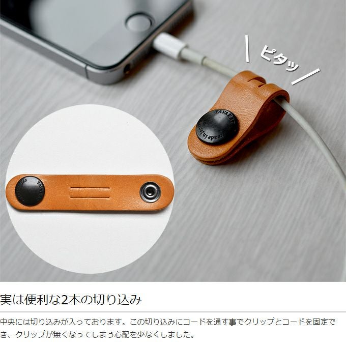 この様な「余り革」を捨てずに活用出来ないだろうかと考え、誕生したのがこのコードクリップ。ベルトなどに使用している本革なので耐久性にも優れており、本革ならではの味わいが楽しめます。