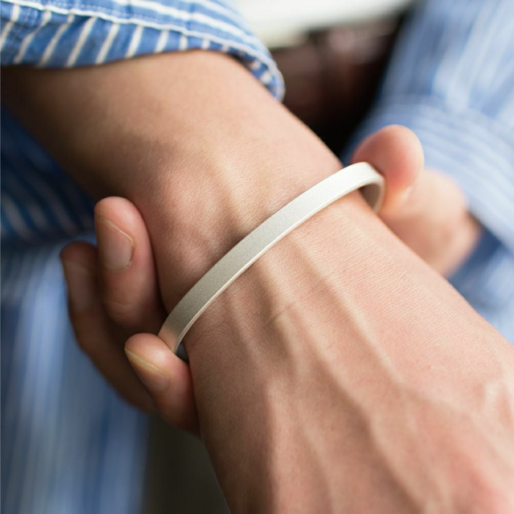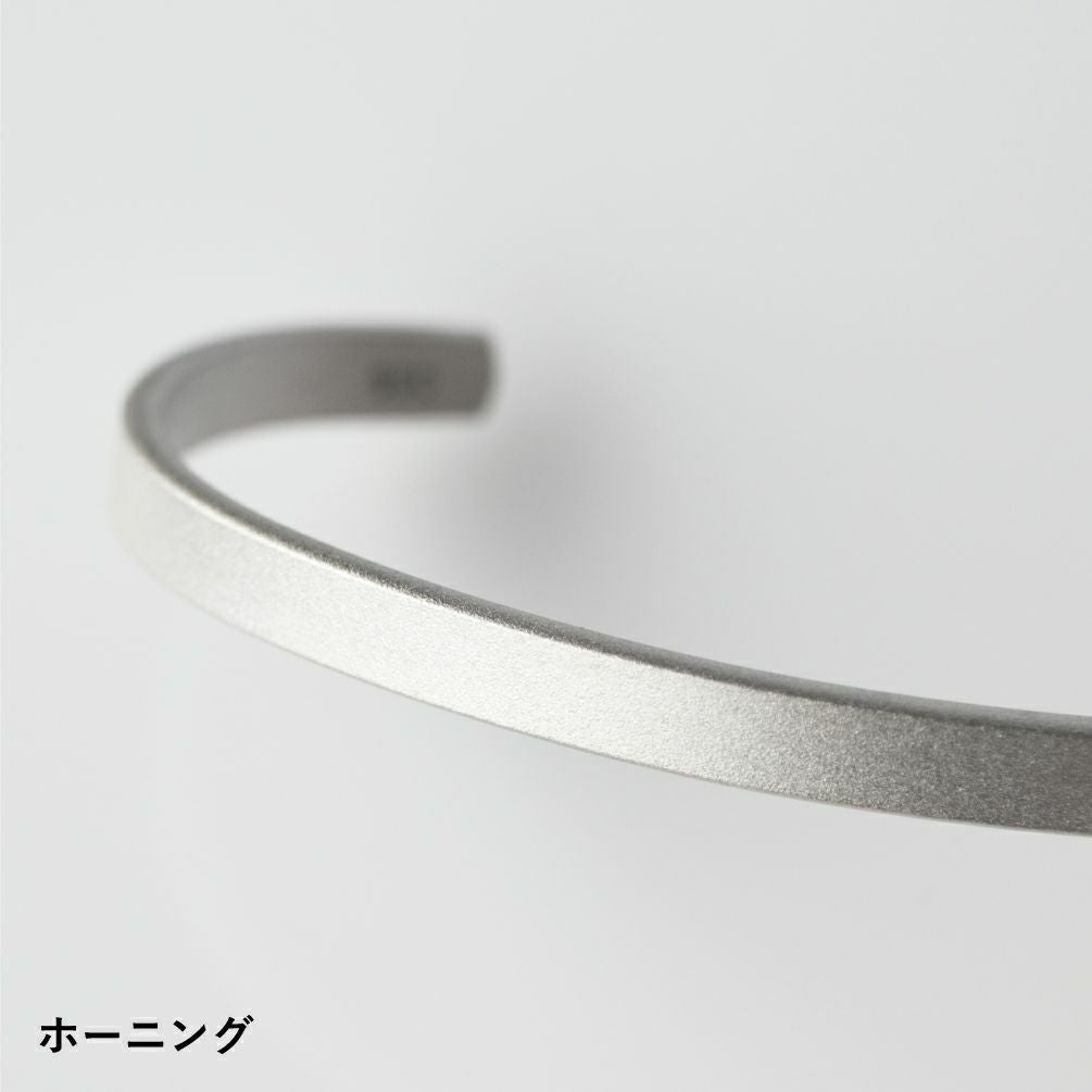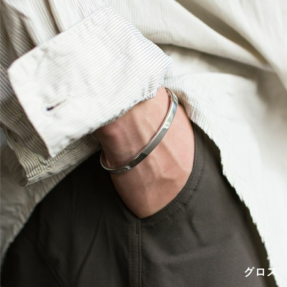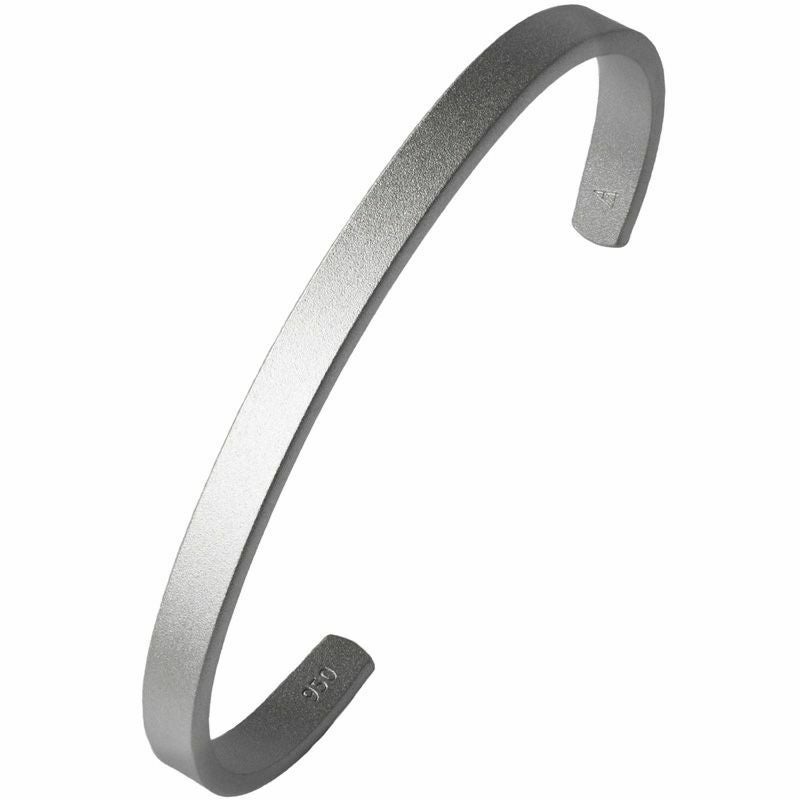 素材にシルバー950を使ったバングル。他の金属より柔らかく熱を伝えやすい性質は、体温が伝わりやすく、身体になじむつけ心地です。