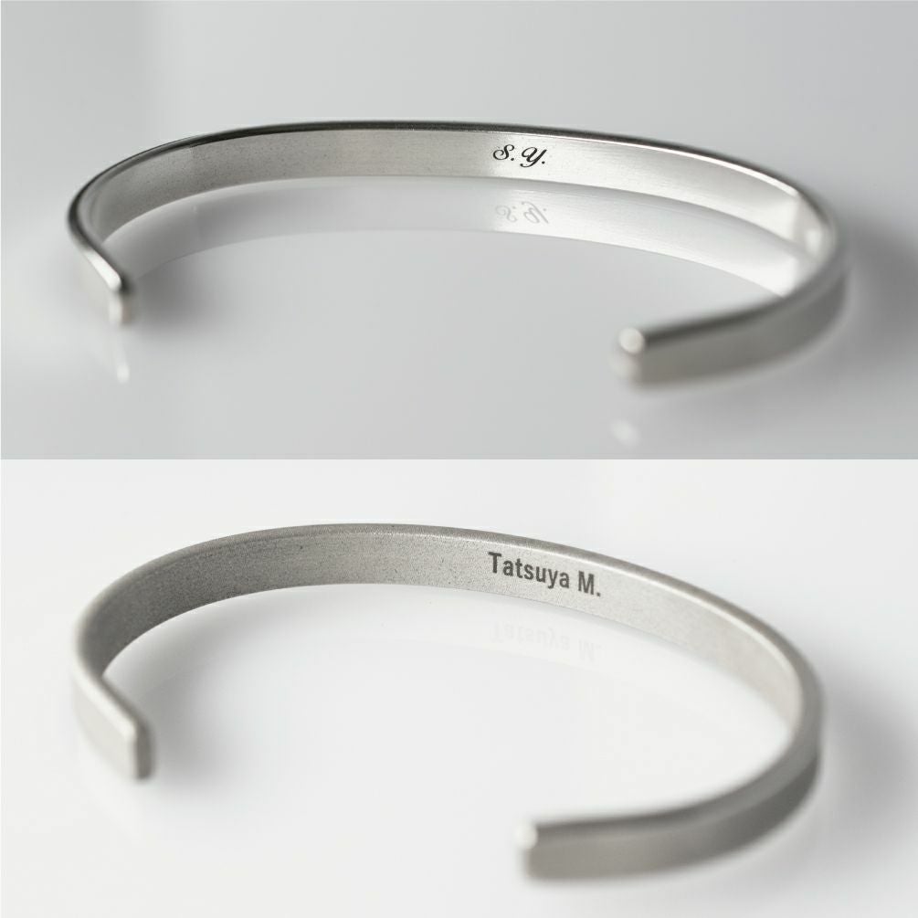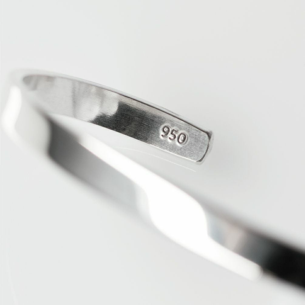 柔らかさを考慮したシルバー950を使用。銀の含有率が高い950を素材とすることで、厚みがあってサイズ調整がしやすくなっております。裏面に刻印入り。
