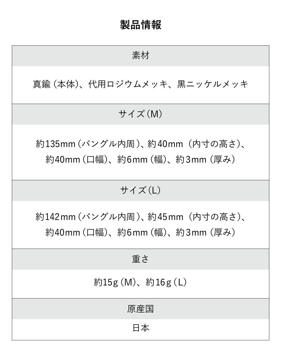 約142mm(バングル内周)、約40mm(口幅)、約6mm(幅)、約3mm(厚み) |