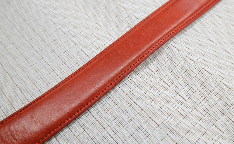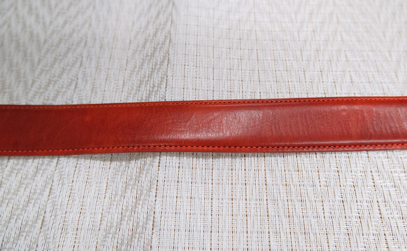 こちらは当店のTps-001ベルト、レッドです。使用している革は姫路ピットタンニンレザー。タンニンでなめし、染料で仕上げた革で透明感のある色合いが魅力ですが、水に濡れて放置するとこういったシミができたりします。こちらはちょっと極端なものですが。