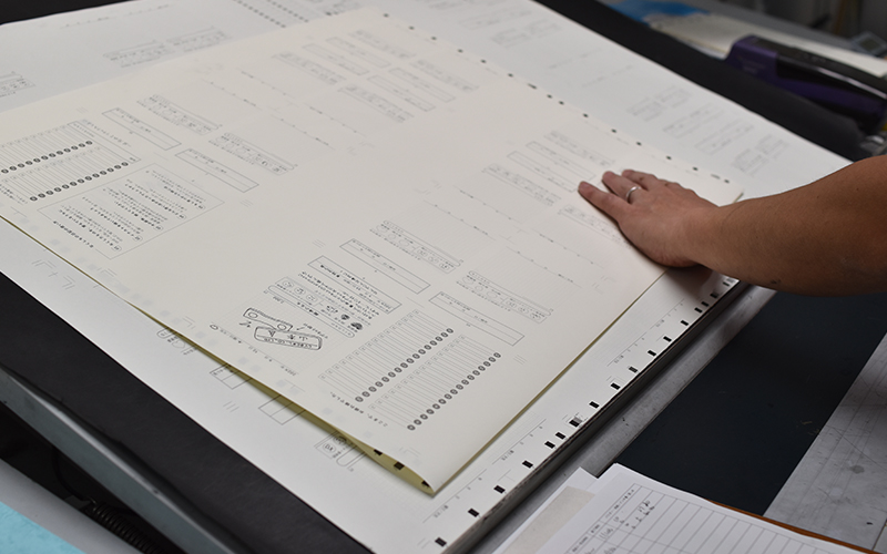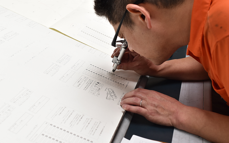 印刷された紙は、専用のマイクロスコープを使って印刷のヨレ・抜けなどがないか、職人さんの目でしっかりと確かめます。