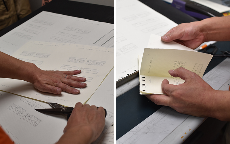 そこから専用のハサミで手早く紙を切って実際の製本の厚みにし、