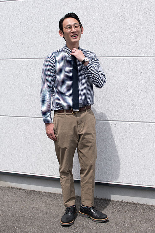 そこで、撮影のために手持ちのニットタイを家から着用してきてもらいました。