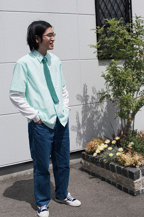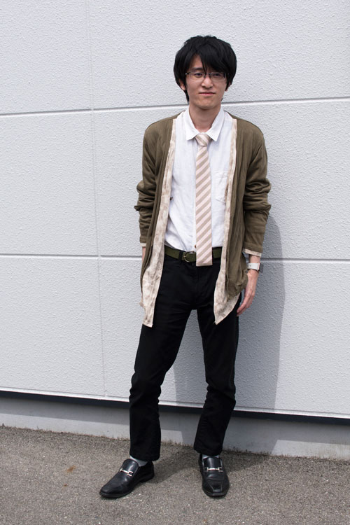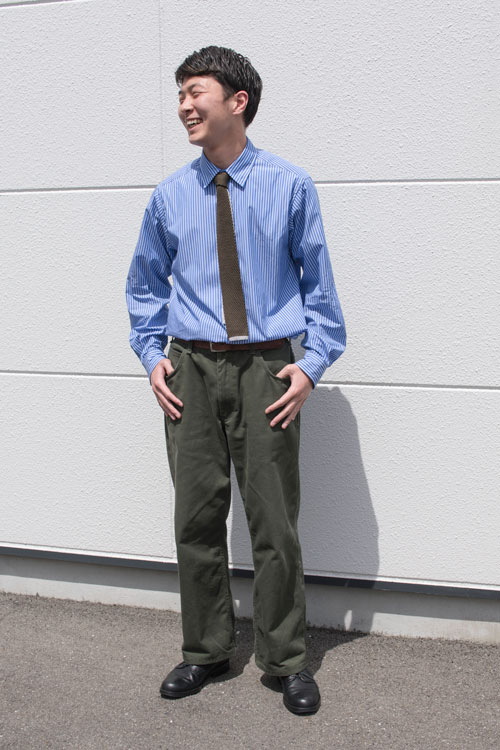 ◆WEBスタッフ佐藤 カラー:カーキ 「服自体がゆったりとしたサイズなので、少し引き締めるイメージでネクタイをしてみました。革靴、カーキのパンツといった男らしいアイテムの中に、ニットタイを合わせることで柔らかさや、可愛さを入れるようにしました。」 ↓Tps-007シルクニットタイ ![]() ![]() |