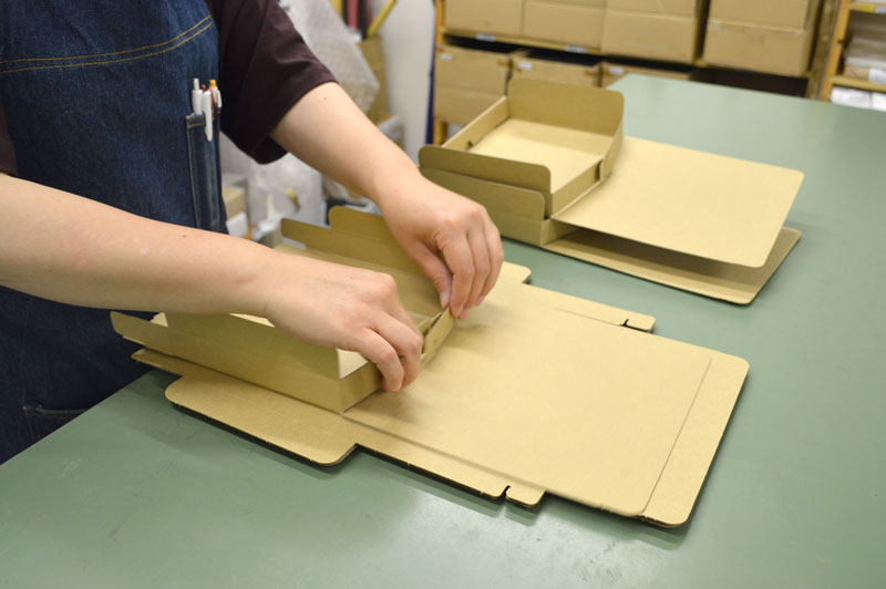 ガサゴソと商品がダンボールの中で動いてしまうことを考慮しつつ、 ゴミになってしまう緩衝材を極力減らすため、一部の商品に関しては、↑上の写真のように、裏側をテープで留めています。以前は、緩衝材をつめていましたが、配送課スタッフのアイデアで一歩前進しました。