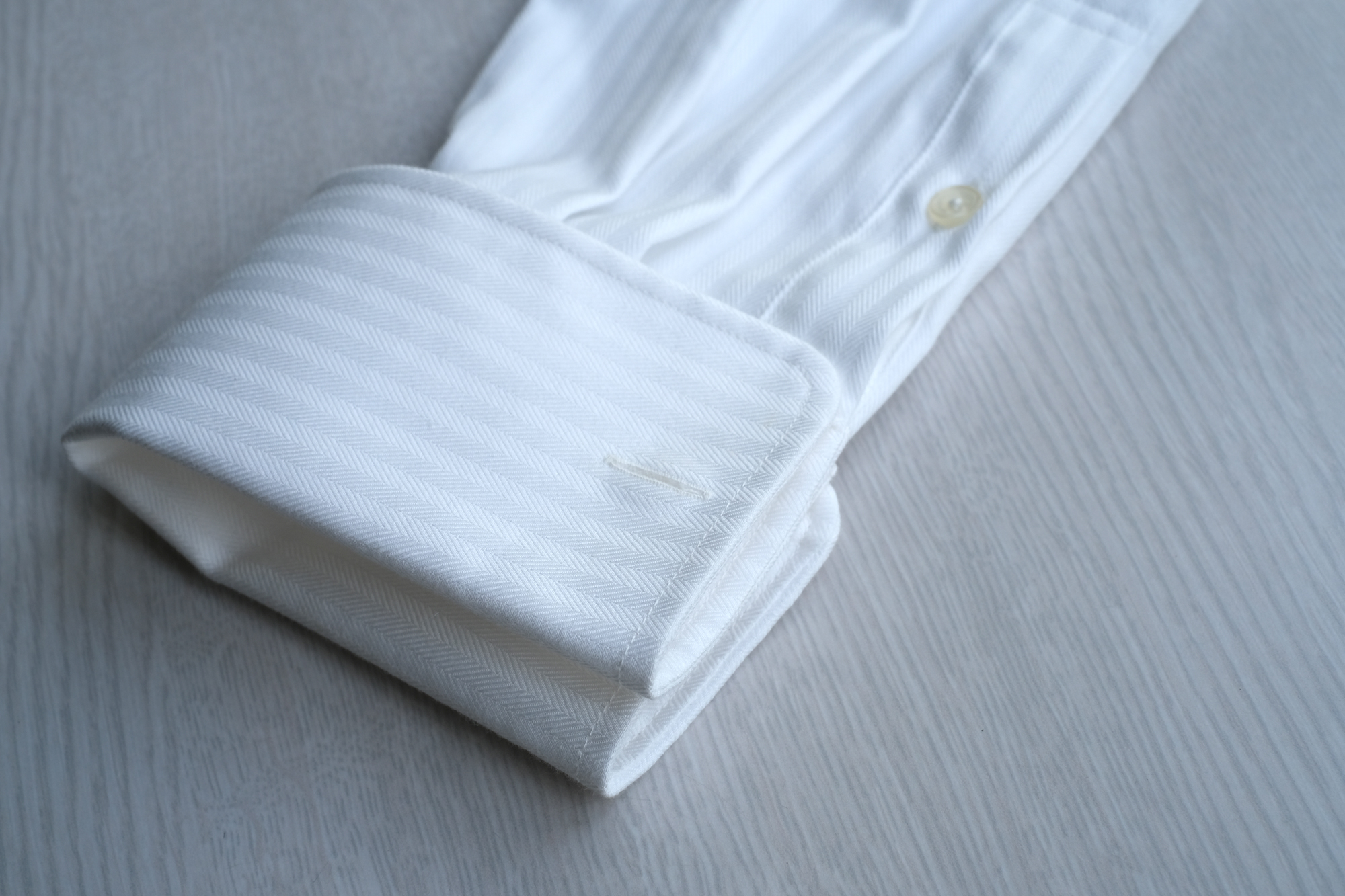 コンバーチブルカフと、スウィヴル式のカフリンクスを使用しています。ダブルカフの場合は、袖先を外側に折っておきましょう。
