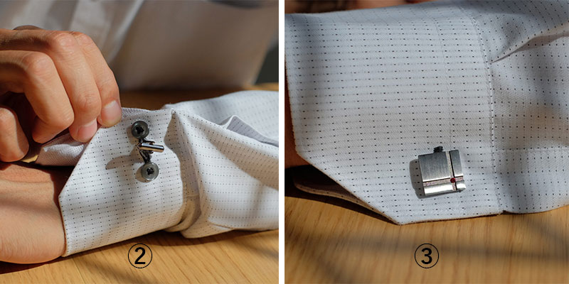 袖口のスリットを合わせて、カフリンクスを通して留めます。結婚式などのフォーマルではもちろん、現在は日常でも使用されています。
