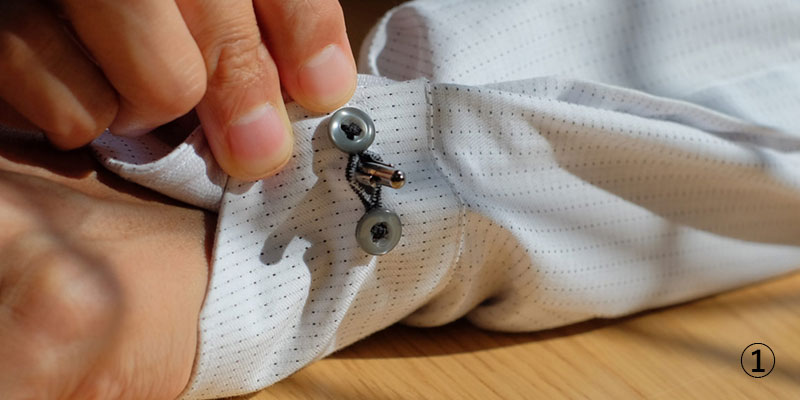①袖の裏と裏を合わせて、カフリンクスを通します。