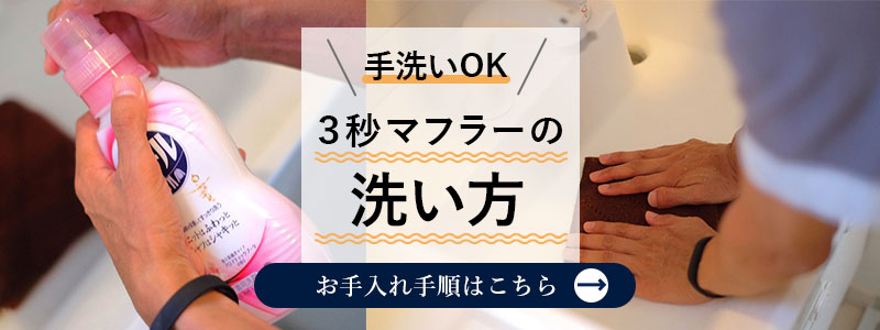 カシミヤの3秒マフラー以外はが手洗い可能です。「おしゃれ着用洗剤」と呼ばれる洗剤を使って洗うのがおすすめです。カシミヤは、ドライクリーニングをクリーニング店にてご相談ください。