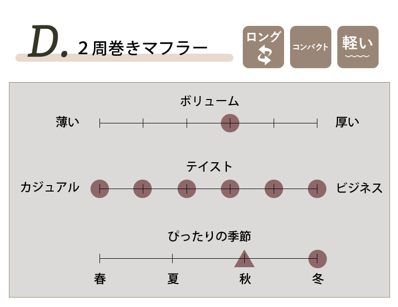 薄手なので、首回りがもたつかず、鞄にもすんなり収まるコンパクトさ。ボリューム感をお求めの方にはおすすめしませんが、気温の高い冬が続く昨今、いちおしのアイテムです。カラーが豊富で全10色。秋から春まで使えるこのミニマフラー、1枚持っていて損はありません!