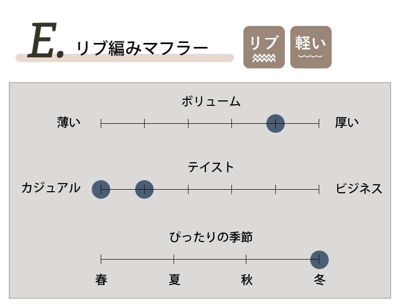 リブ編みで作ることで、定番Aよりボリュームがアップ。スウェットやニットにも合わせやすいボリューム感で、首を覆う箇所も広く、暖かさも十分です。