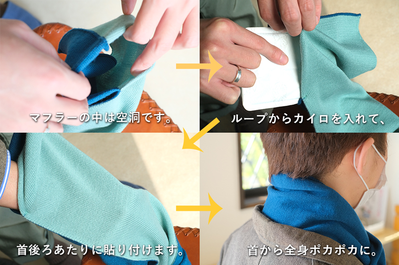 3秒マフラー(リブ以外)の中は空洞になっていますので、中に貼るカイロを入れることも可能です。薄さが特徴の定番タイプ(Tps-020)やストライプ(Tps-094)を、時々暖かく使いたいという方は、ぜひお試しください。剥がすときには糸をひかないように、ゆっくりと剥がしてくださいね。