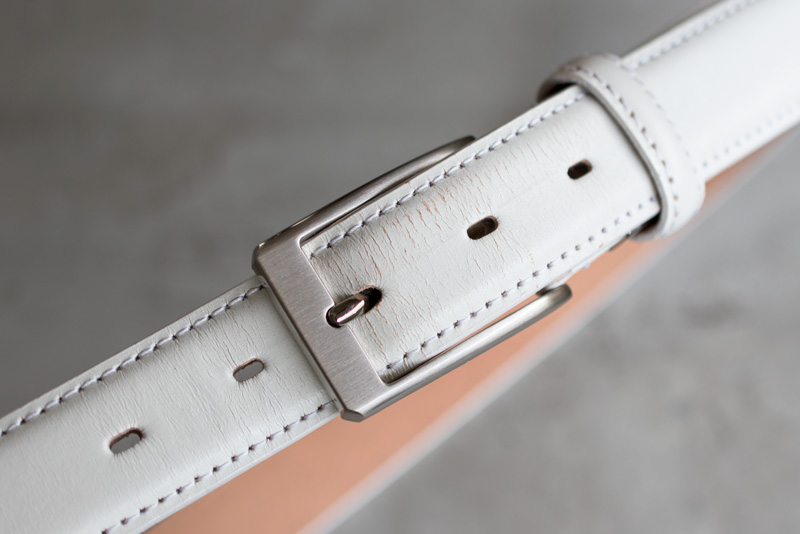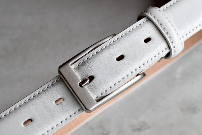 Tps-130のベルトは染料によって革の芯まで染めた後、 顔料によって表面を染めたセミアニリン仕上げ。 一定の革らしさを残しながら、均一で落ち着いた仕上がりが特徴です。