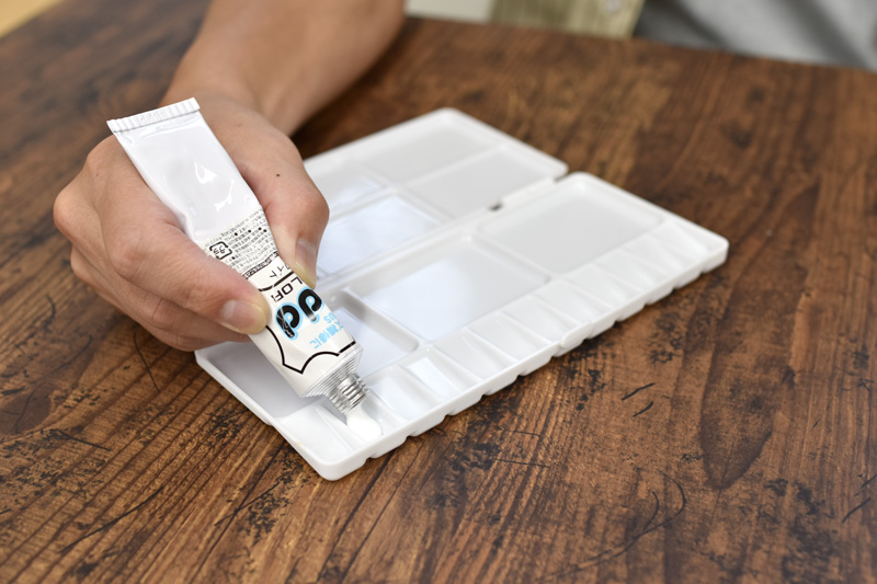 パレットなどの上にホワイトのアドカラーを出し、少量の水で少しずつ溶かします。