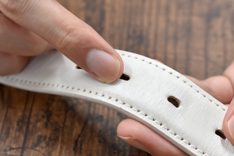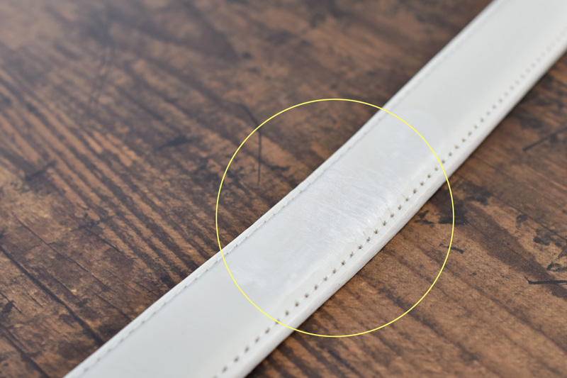 経年変化しにくく、きれいなまま楽しめますが、画像の様にホワイトは仕様上、革の芯まで白く染める事ができません。