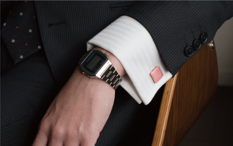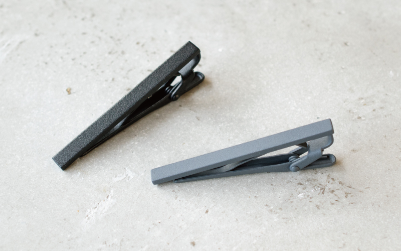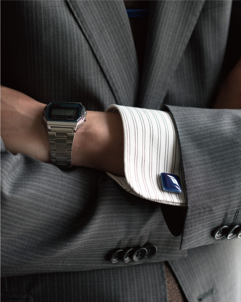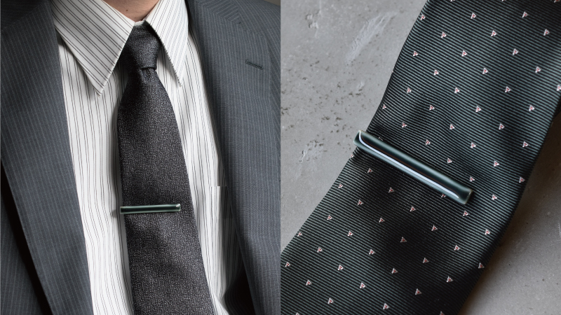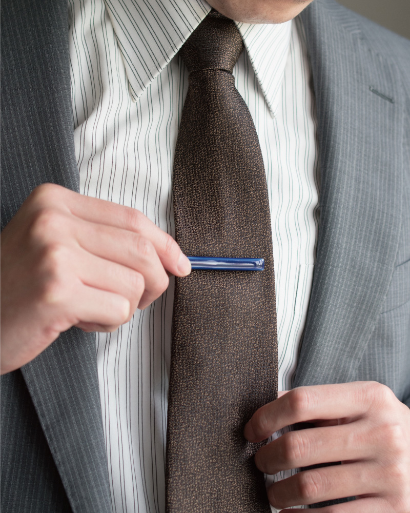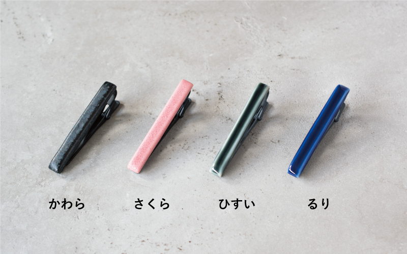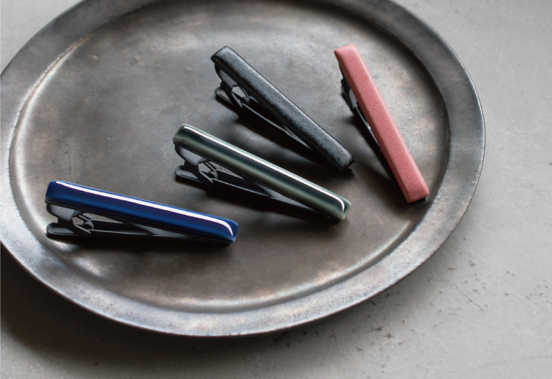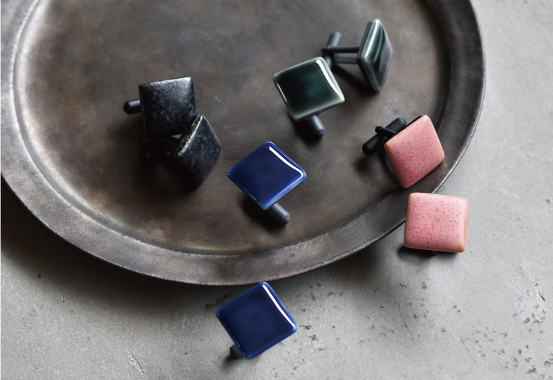 こうしてたくさんの工程を経て完成した陶器のネクタイピンとカフス。素材特有の質感は、金属や革とはもちろん異なっていて、ネクタイやシャツの繊維ともまた異なります。そこに釉薬が加わることで出来る、金属よりも柔らかい光沢感や、素地が活きるマットな質感。それらを洋服に組み合わせて生まれる新鮮さ、高揚感をぜひみなさんにも感じていただきたいです。
