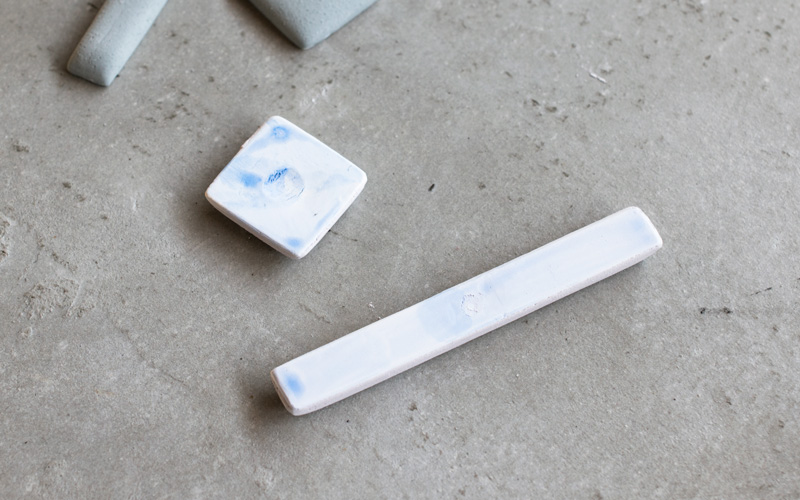 まず初めに。陶器は土を焼き上げて作ります。お皿やマグカップなどの大きいものでも焼く前、後の大きさ・形の変化を様々に想定しながら製品としての形に整えていきますが、小さくなればなるほどその変化は大きく、形を整えることが困難になります。特にネクタイピンのような細く薄いパーツは焼いた際に反りあがり、土台との接地を難しくします。
