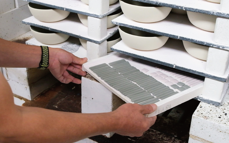 釉薬を塗り終わったものを2回目の焼き、本焼成することで陶器としてネクタイピン・カフスのトップが完成するのですが、素焼き・本焼成ともに、温度によって出来上がりが変わったり、土の収縮率を考えて最初の成形をする必要があったりといくつもの工程をクリアして出来上がります。
