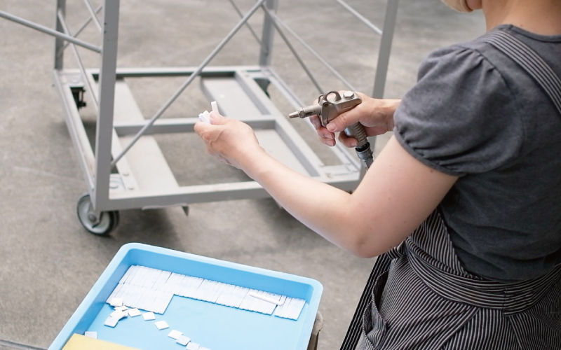 まずこちらは、型で成形した素地を一度素焼きしたあと、釉薬を塗る前に細かなほこりなどを飛ばしているところです。この時に、形が悪いものなど検品も同時に行っています。
