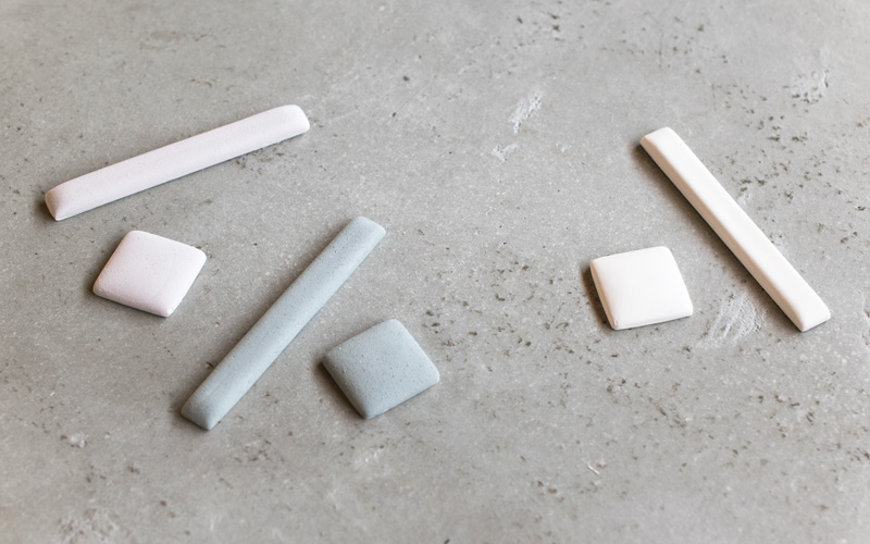 写真左からピンク系、グレー系の釉薬に浸した焼成前のもの、素焼きのもの