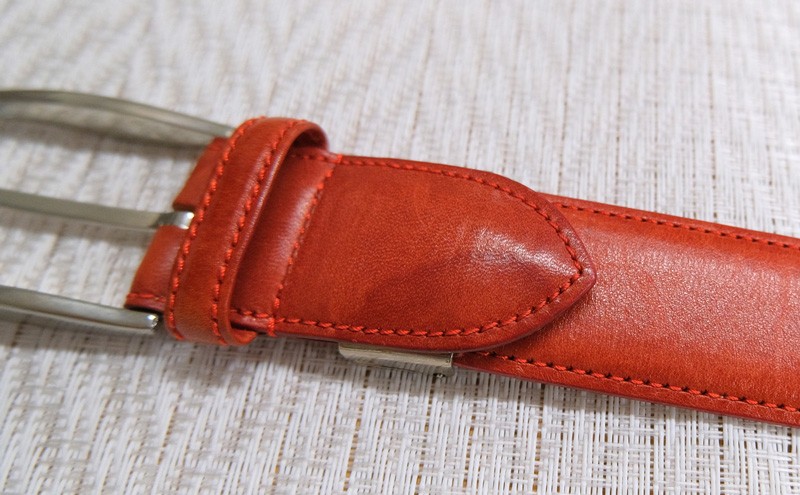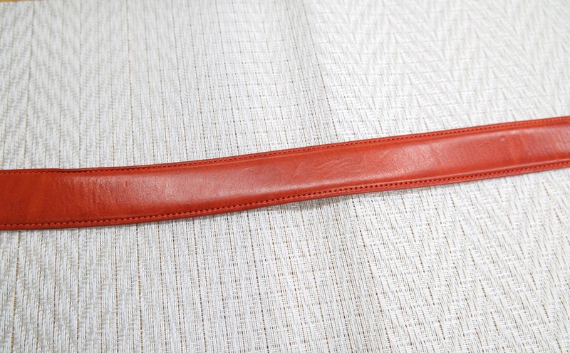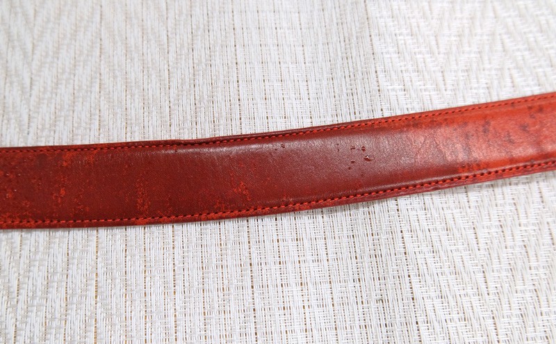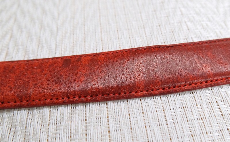 こちらは当店のTps-001ベルト、レッドです。使用している革は姫路ピットタンニンレザー。タンニンでなめし、染料で仕上げた革で透明感のある色合いが魅力ですが、水に濡れて放置するとこういったシミができたりします。こちらはちょっと極端なものですが。