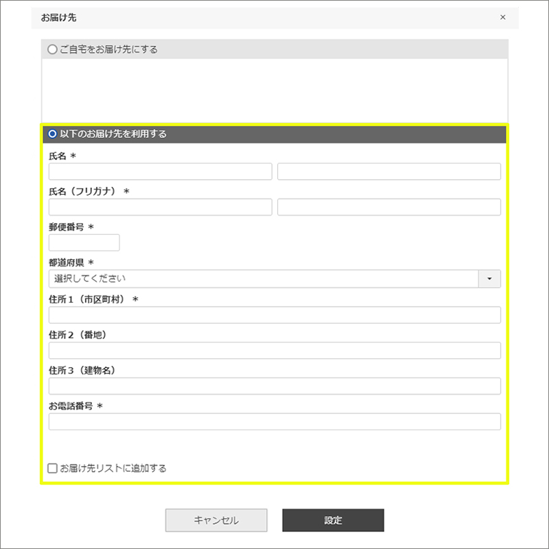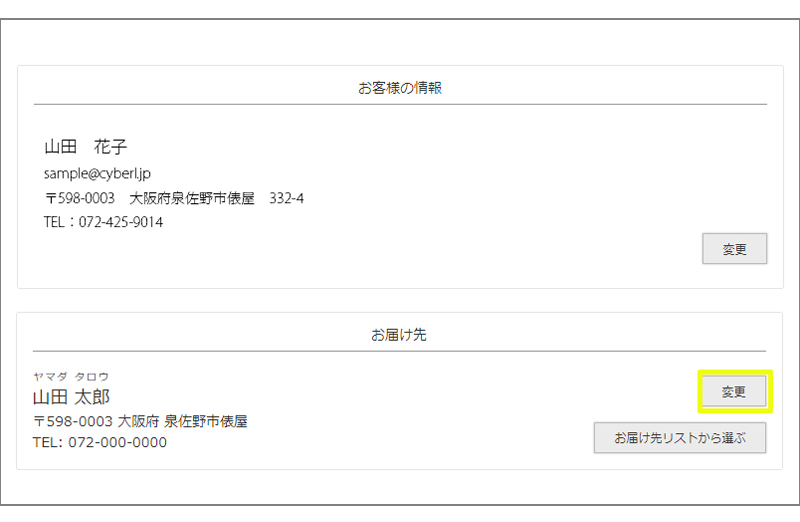 変更ボタンを押して、お相手のお名前、住所、連絡先を入力します。入力ができましたら、設定ボタンをクリックします↓。