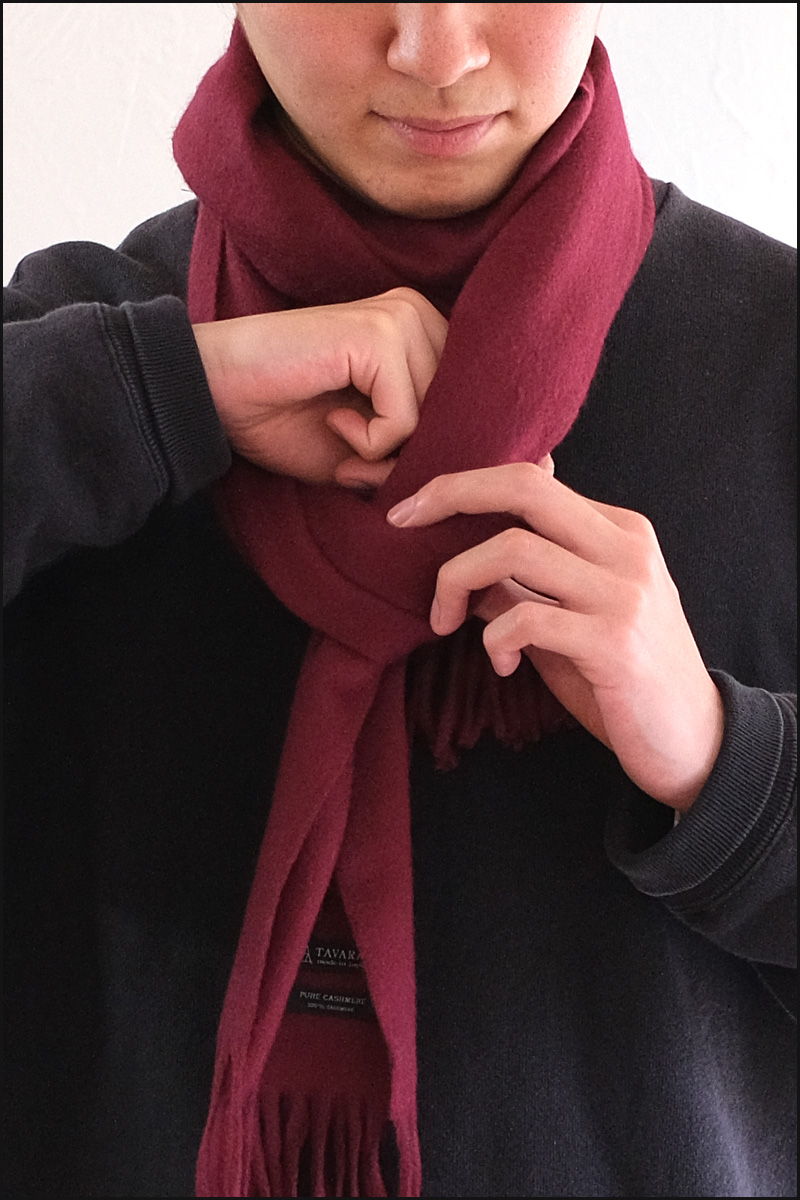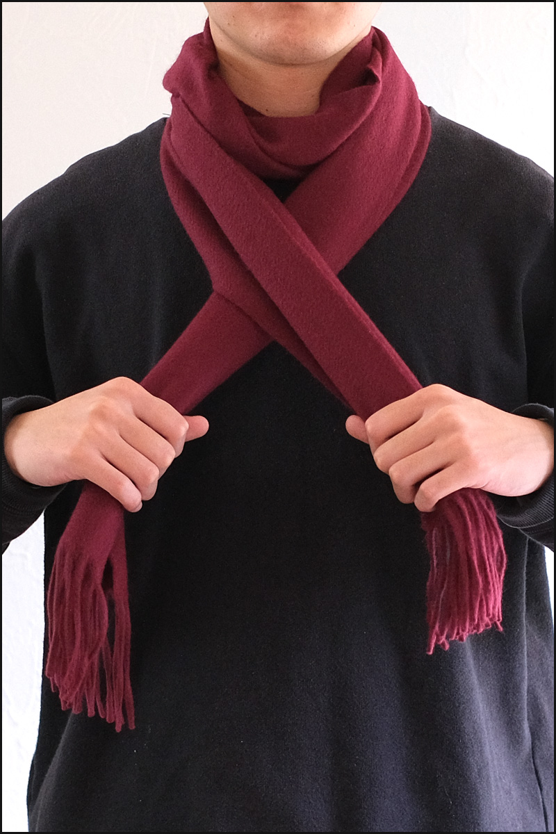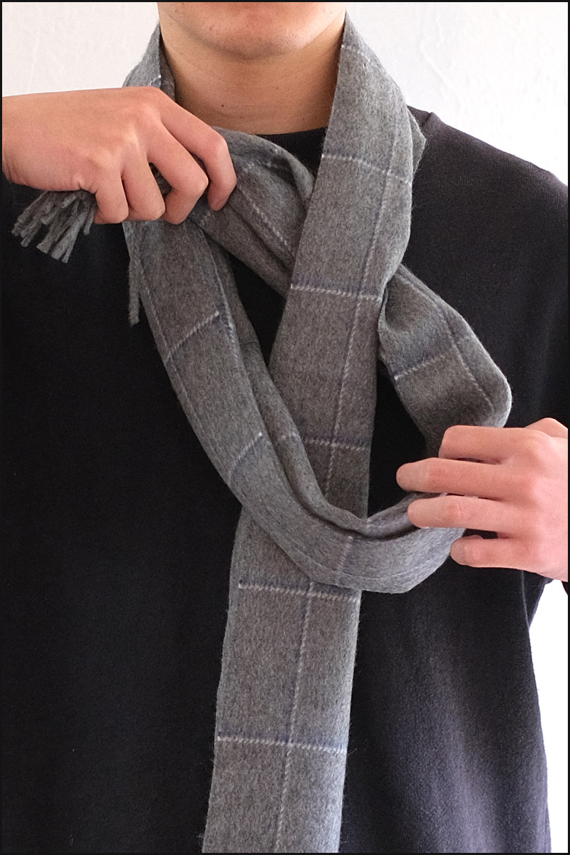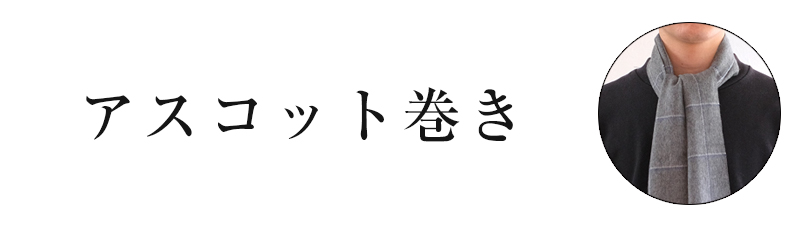 アスコット巻きをコンパクトかつ首元に厚みを出した見た目。薄手のストールやカシミアのマフラーに合う、上品で落ち着いた巻き方です。