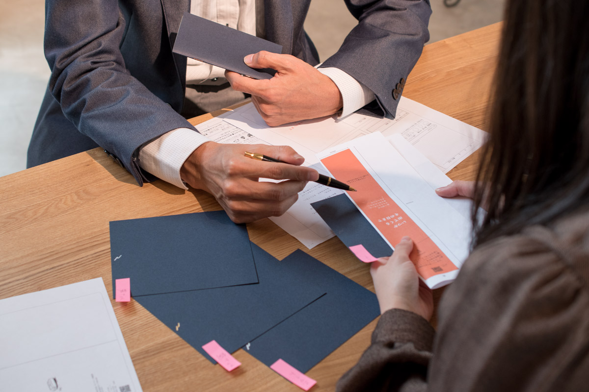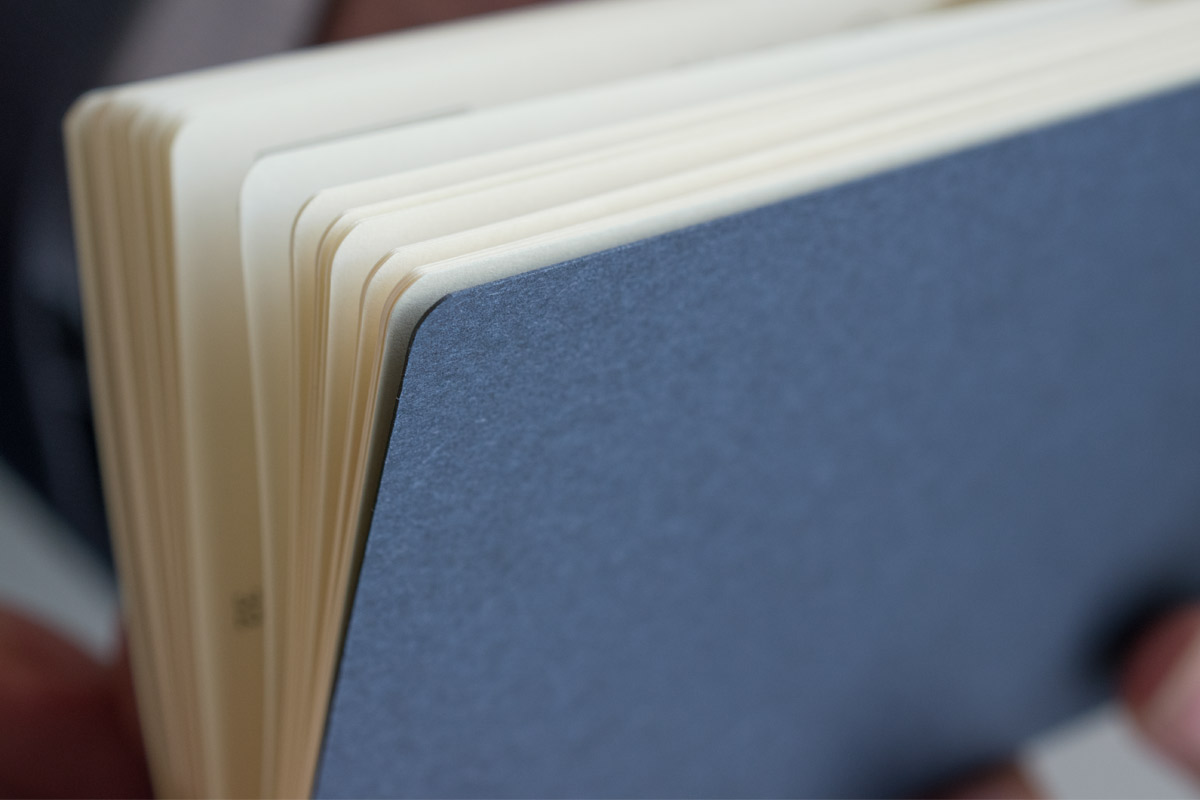 日記づくりは初めての経験でしたので、製品作りをご一緒頂いた神戸派工場さんにアドバイスを頂きながらセレクトしていきました。表紙には先述のとおり上品な外観に仕上がるように深いネイビーカラーの用紙を、そして、中には暖かみがあって目が疲れにくいクリームキンマリを選択。この紙は小説などにも使われ、驚くほどになめらかな質感。幅広い筆記具と相性が良いのもメリットです。